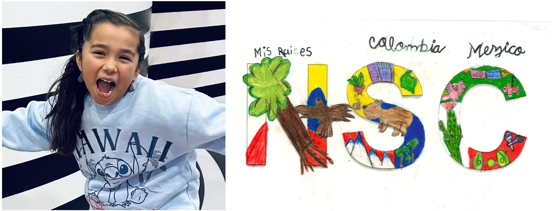 Marianna wanted to include her roots by incorporating both sides of her heritage. Her mom was born in Colombia and her dad was born in Mexico. Marianna drew pictures of what she loves from each county that have been taught to her and took part of her identity as an American-Mexican-Colombian girl.